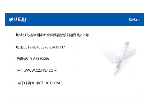 地址:常州市新北區友邦商務大廈1幢16、17層  電話:0519-85101652  傳真:0519-85112595  郵編:213022  網址:www.cz-jiayue_cn.after80design.com  郵箱:xiajifengaa@163.com